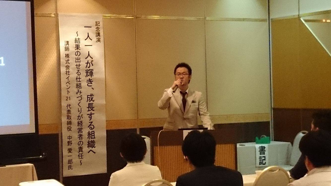 記念講演には、奈良県中小企業家同友会から株式会社イベント21の代表取締役中野愛一郎氏をお招きし、「一人一人が輝き、成長する組織へ~結果の出せる仕組みづくりが経営者の責任~」をテーマに、倒産寸前の会社から10年後には100人企業になるまでの苦悩や熱い想いをお話しいただきました。